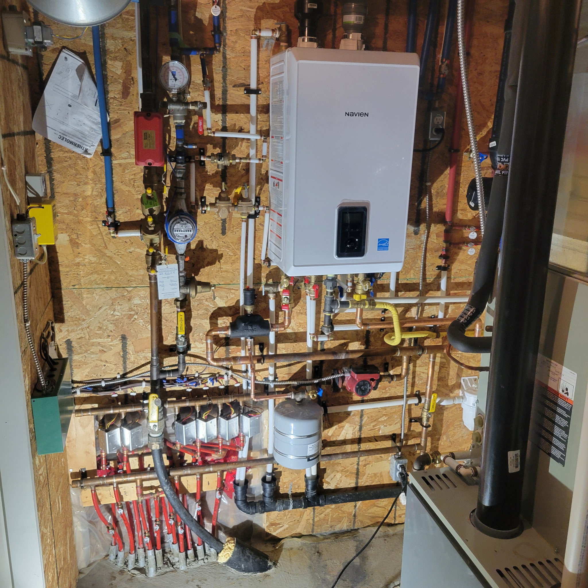 Complete Navien tankless water heater installation with full in-floor radiant heat manifold, expansion tank, zone valves, and copper piping rough-in completed in a Kelowna home.