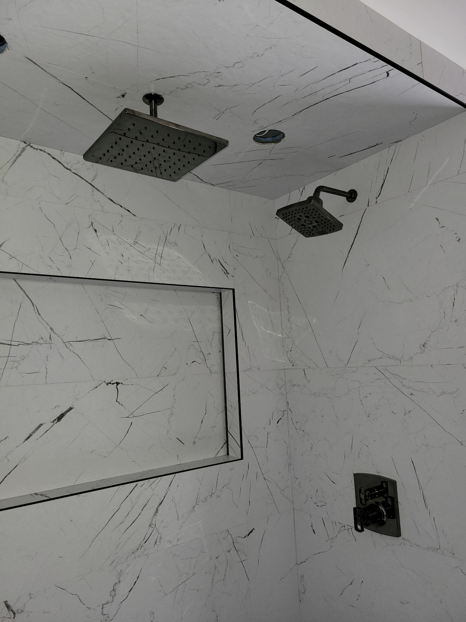 High-end shower featuring ceiling-mount and wall-mount matte black square rain heads, thermostatic valve, recessed niche, and full white marble surround installed in a Kelowna home.