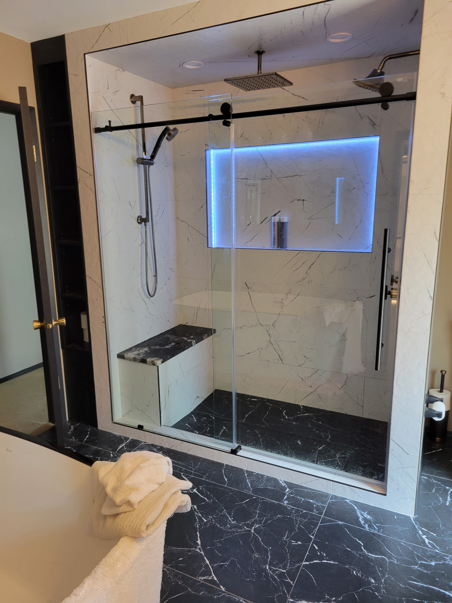 Full luxury shower build featuring dual rain heads, frameless sliding glass enclosure, marble surround, built-in LED niche, and a custom marble bench seat in a Kelowna home.