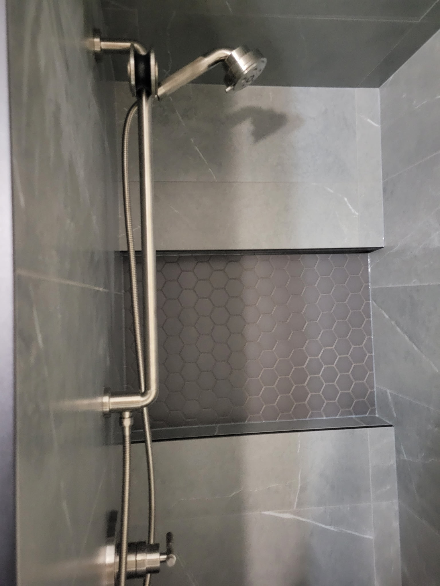 Modern shower rough-in with grey large-format stone tile surround, recessed hexagon mosaic niche, and brushed nickel slide bar with hand shower completed in a Kelowna home.