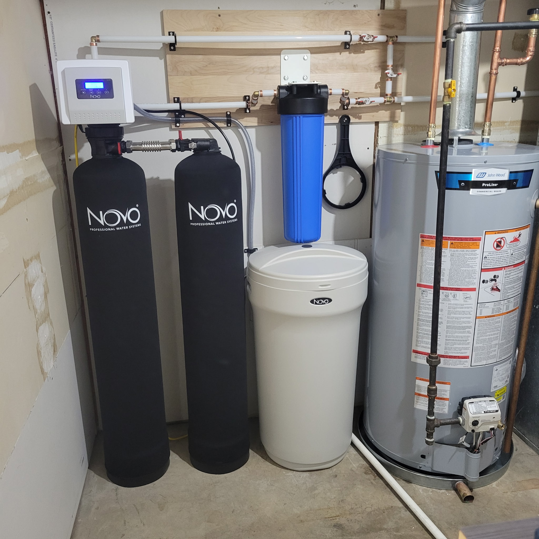 NOVO dual-tank water softener system with whole-home sediment pre-filter and hot water tank, fully plumbed with copper in a Kelowna home.